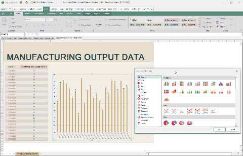 Vole Excel supports multiple types of charts, such as: Column, line, pie, bar area, scatter, stock, doughnut, bubble, radar, treemap, sunburst, histogram, box and whisker, waterfall and funnel.
