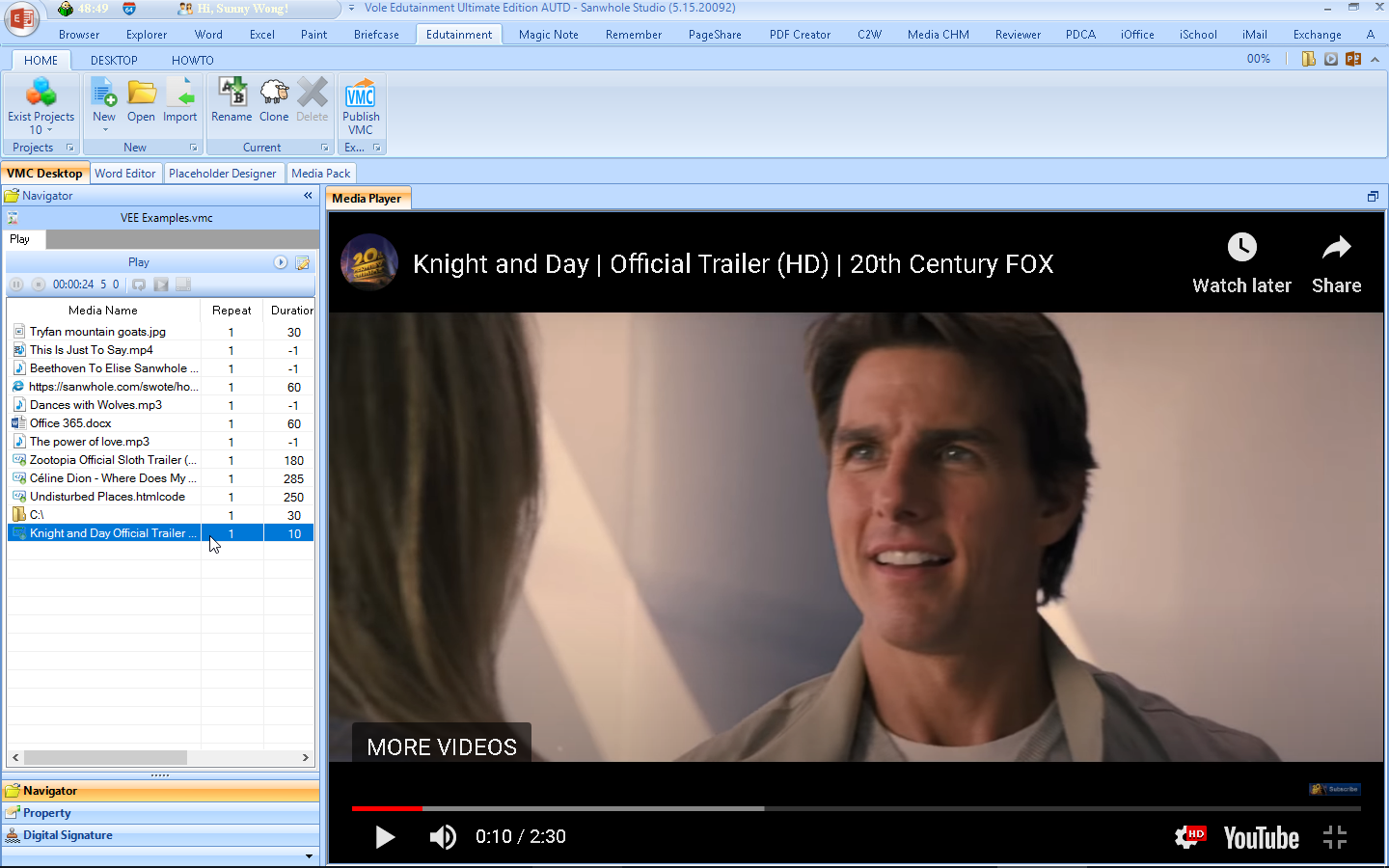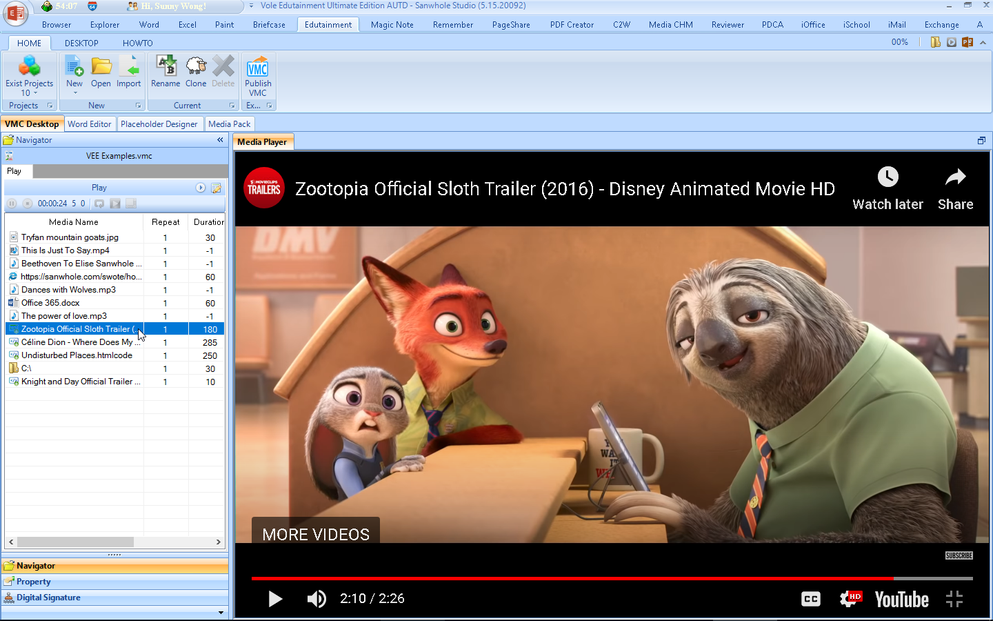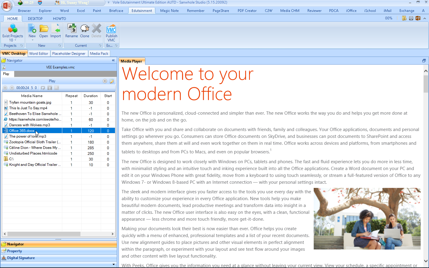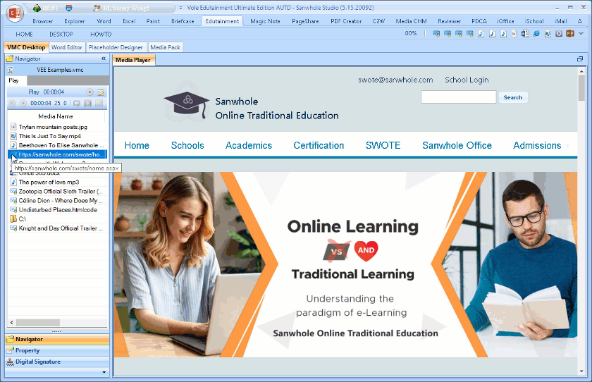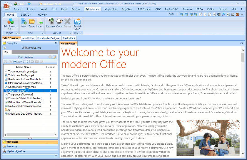 Vole Edutainment combines various local and online resources to generate a single file quasi-movie, and automatically plays them in the built-in media player according to your preset duration and sequence. Freely demonstrate your ideas, let readers don't need any operation to enjoy the quasi-movies directed by you just like watching movies. Vole Edutainment supports a variety of movie materials such as local disk Image, Audio, Video, DOCX, PDF, MHTML, CHM, etc. and online resources such as webpages, YouTube video and online MP4, etc.