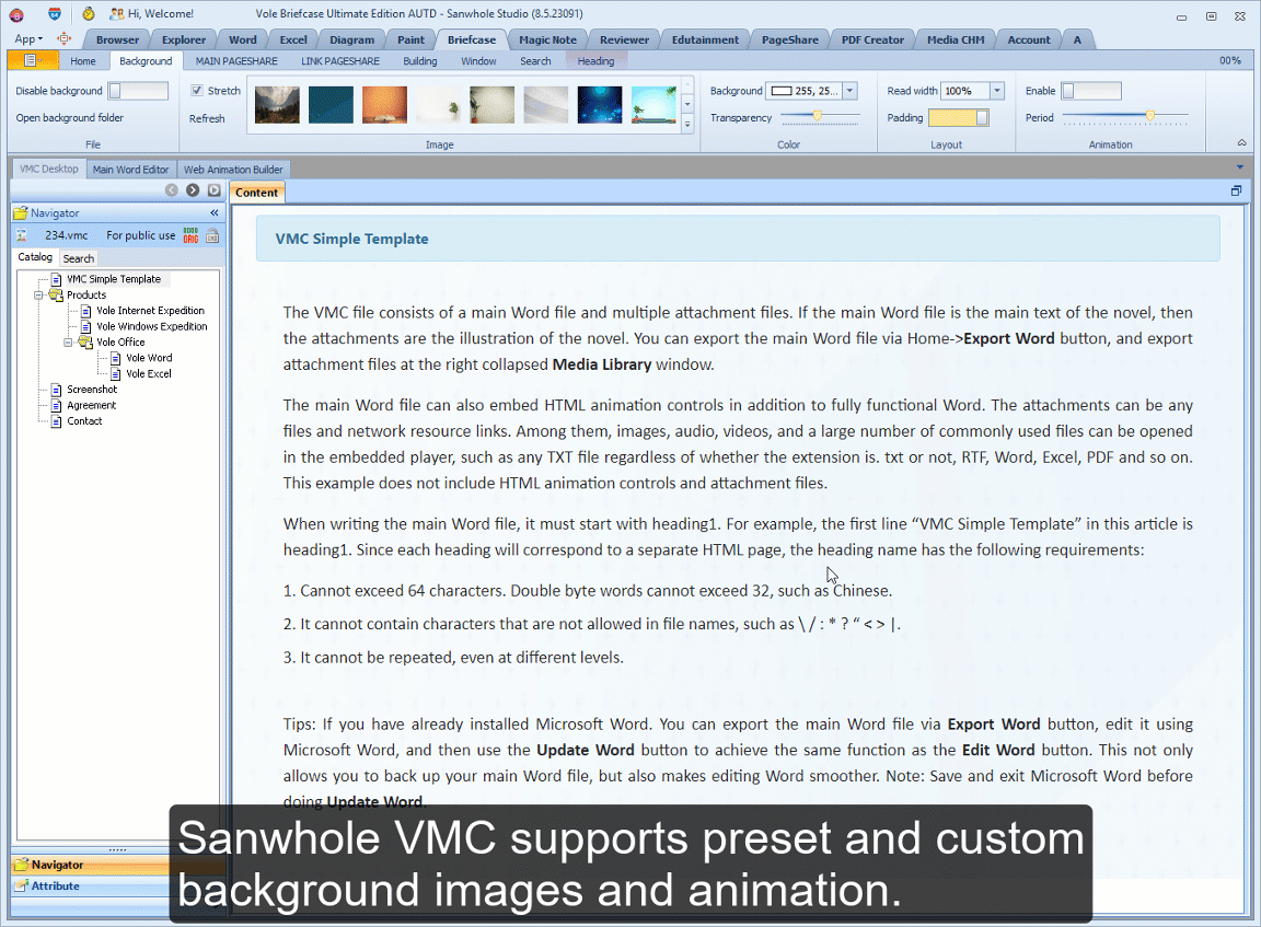 Whether for presentation or self-appreciation, just the right amount of rendering will make the article pleasing to the eye. Vole Briefcase provides a fully functional Word editor that allows you to write any professional document with ease. Vole Briefcase records the source of your creative inspiration at any time by adding reference files and network link annotations. It should be emphasized here that Vole Briefcases can also incorporate various web animation controls into the work to enhance its appeal. 不论是演示还是自赏,恰到好处的渲染会令文章赏心悦目。Vole Briefcase提供全功能的Word编辑器让你书写任何专业的文档都会得心应手。Vole Briefcase通过添加参阅文件和网络链接批注来随时记录你创作灵感的来源。这里还要着重讲讲, Vole Briefcase还可以在作品中加入各种Web动画控件来提高作品的吸引力。 The Sanwhole Web Animation Control includes a series of controls with HTML5 animation effects, such as Hover Zoom, Zoom Modal, Slideshow, Accordion, Light Box, Accordion, List Scroller, Advanced Tabs, Tree, Custom HTML Code, etc. Slideshow is familiar, while Custom HTML Code supports any HTML CODE. Its typical application is to display YouTube videos, BiliBili videos, or real-time website web pages. Sanwhole网页动画控件包含一系列具备HTML5动画效果的控件,比如: Hover Zoom, Zoom Modal, Slideshow, Accordion, Light Box, Accordion, List Scroller, Advanced Tabs, Tree, Custom Html Code etc. 幻灯片很熟悉,而自定义HTML代码(Custom Html Code)支持任何HTML CODE, 典型应用是在Word中显示YouTube视频, BiliBili视频,或是显示实时网站网页。 Please see the example below. 请看下面的例子。