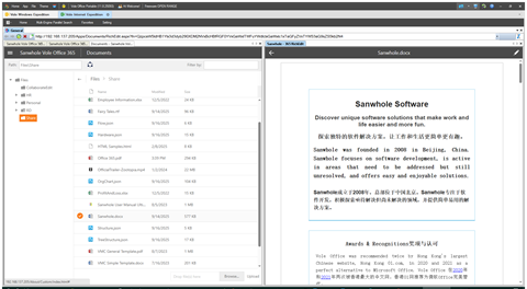 Whether deployed on the Internet or on the LAN, the 365 server can provide users with cloud-based services, including: file permission management, user management, Word, Excel, Diagram and other file editing, multiple file preview, collaborative editing, mail services, scheduling, and contact services. Users do not need to install any software; they only need a browser to use it. Supports multiple operating systems such as Windows, Linux, and Mac. Supports multiple devices such as PC, Phone, Pad, etc.