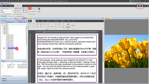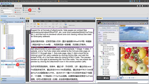 Note pages can embed files (pictures/audio/video/Office/PDF, etc.) and links (websites/Bilibili/YouTube, etc.), and the built-in previewer allows one-click viewing without the need for third-party software.